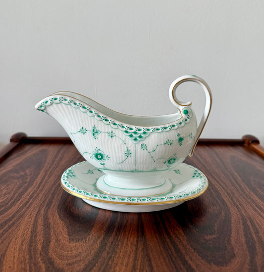 Royal Copenhagen sauce jug in Green Fluted Half Lace with gold.
