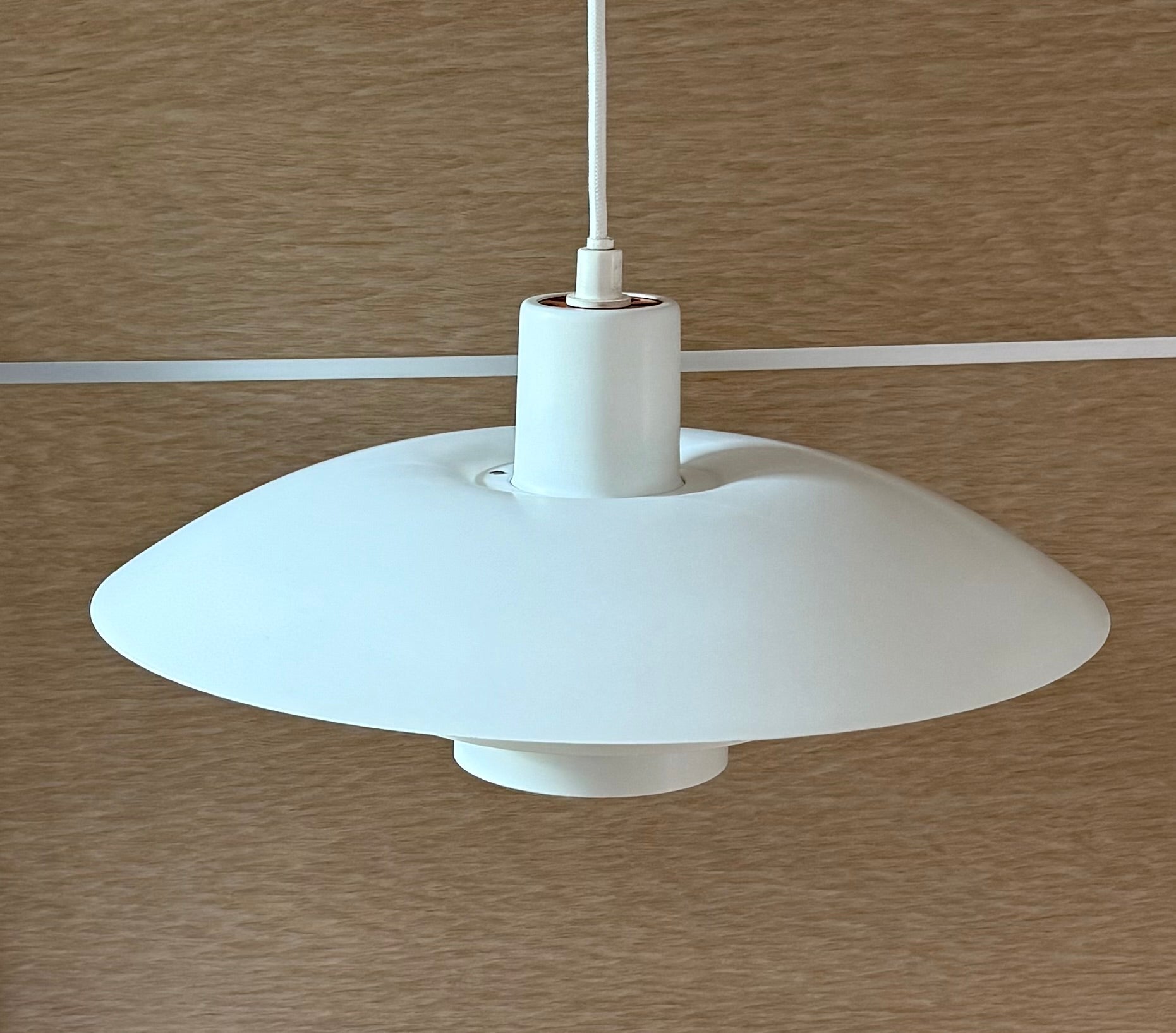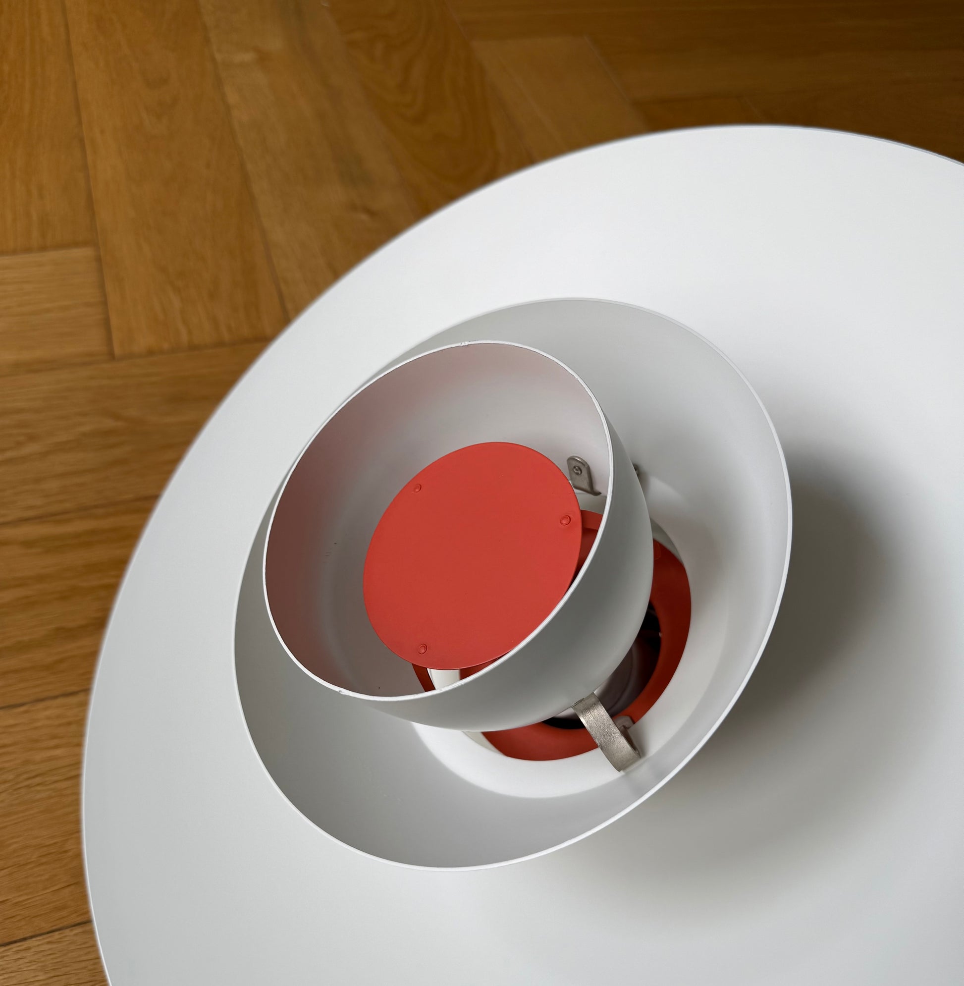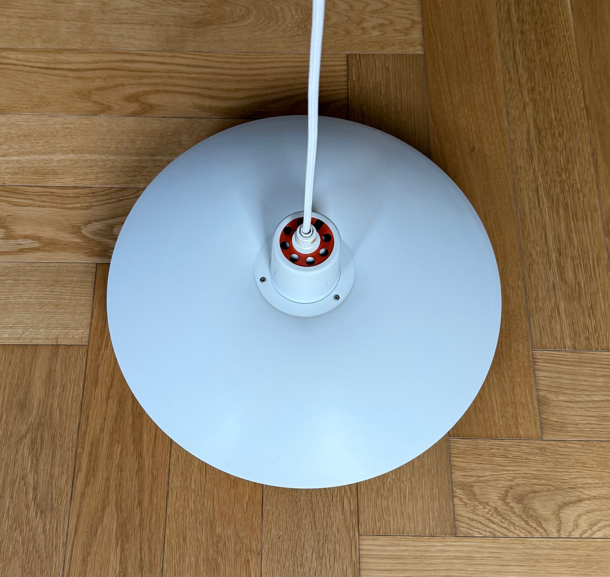 The lamp is delivered with an E27 porcelain bulb socket, an orange cover plate, a 250 cm. long textile cable and the original Louis Poulsen sticker.