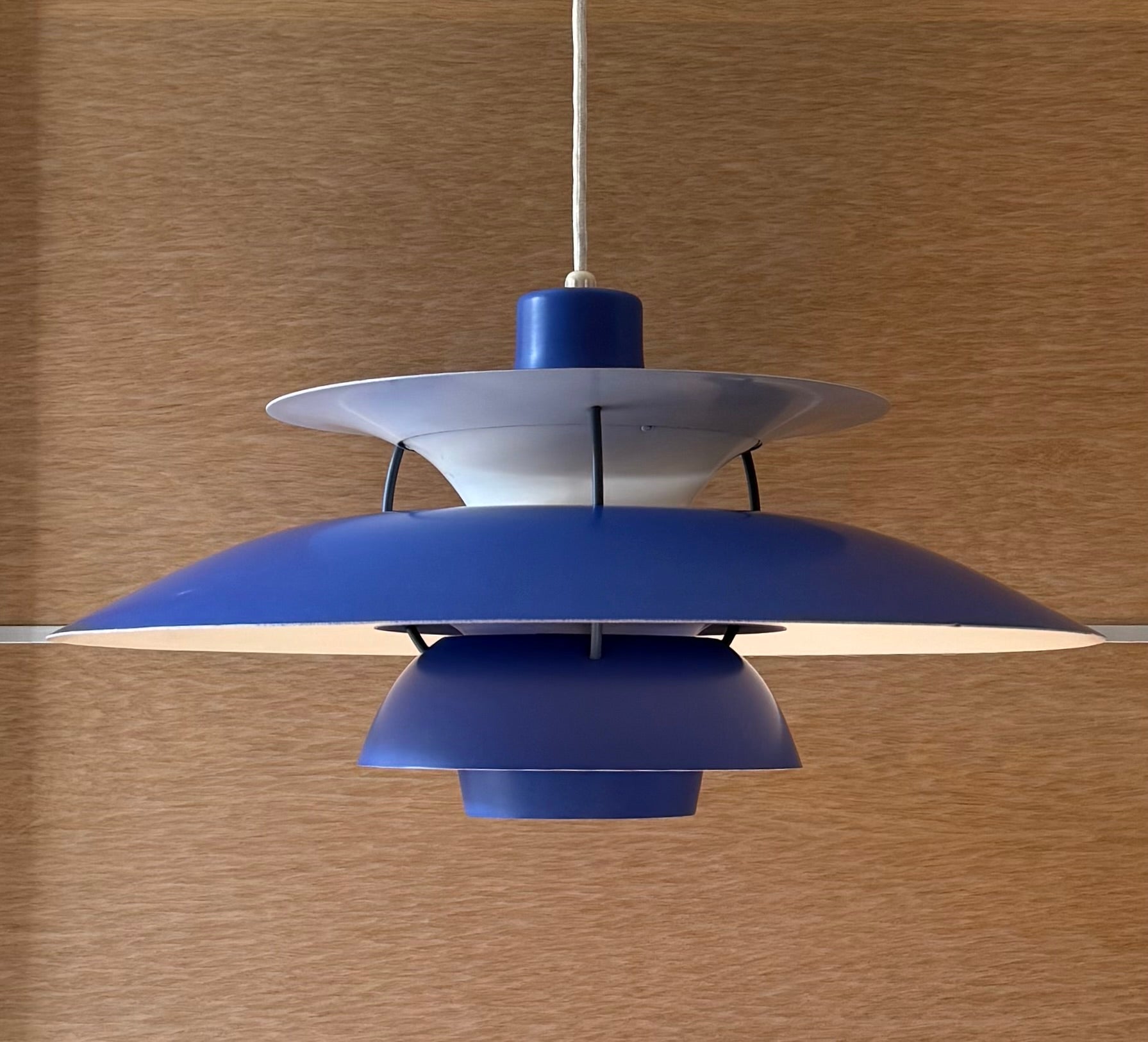 Original blue PH 5 pendant lamp (dia: 50 cm). Designed by Poul Henningsen and produced by the Danish company Louis Poulsen. This is one of the first versions of the lamp produced around 65 years ago. The lamp is in a very good condition with just a few small signs of use (please pay particular attention to the last picture).